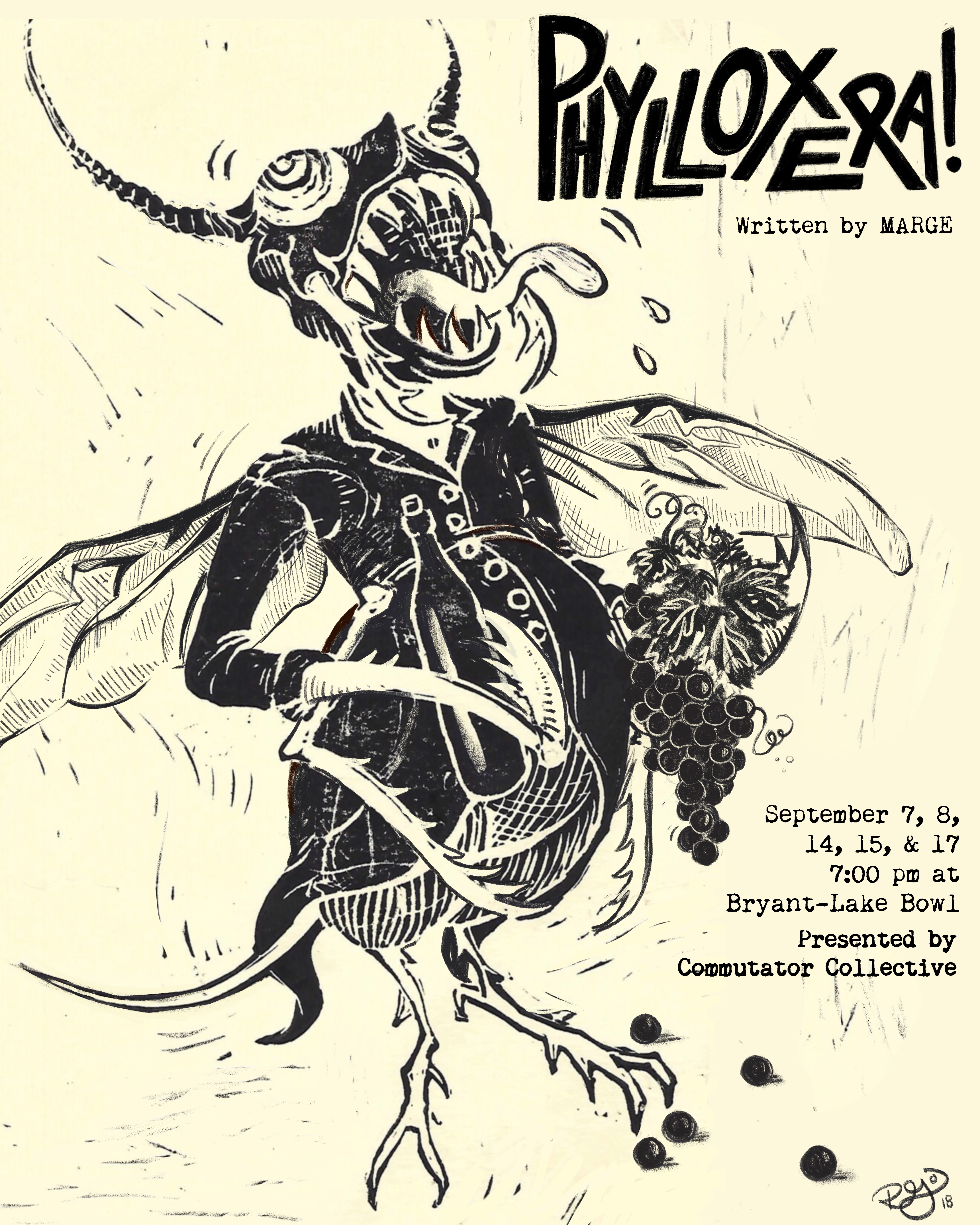 PHYLLOXERA! was created in the early summer of 2018 and was produced during a month-long residency at the Bryant-Lake Bowl. It ran for two weekends in September 2018 and was the inaugural production of Commutator Collective. You can read the script on the New Play Exchange, or you can email us for a copy.