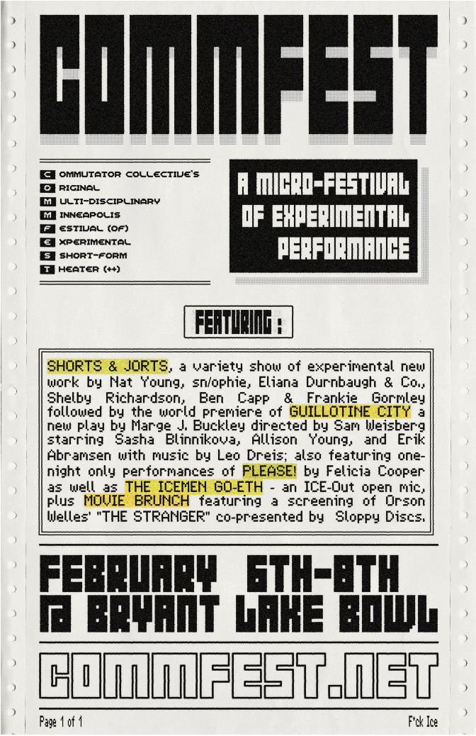 COMMFEST played at the Bryant Lake Bowl on February 6-8, 2026. it featured the work of more than twenty-five Minnesota artists and was funded through a grant from the Metro Regional Arts Council & the Minnesota Arts & Cultural Heritage Fund.